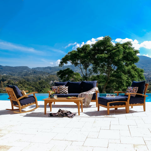Abbington Teak Wood 3 Piece Patio Conversation Set with Navy Cushion