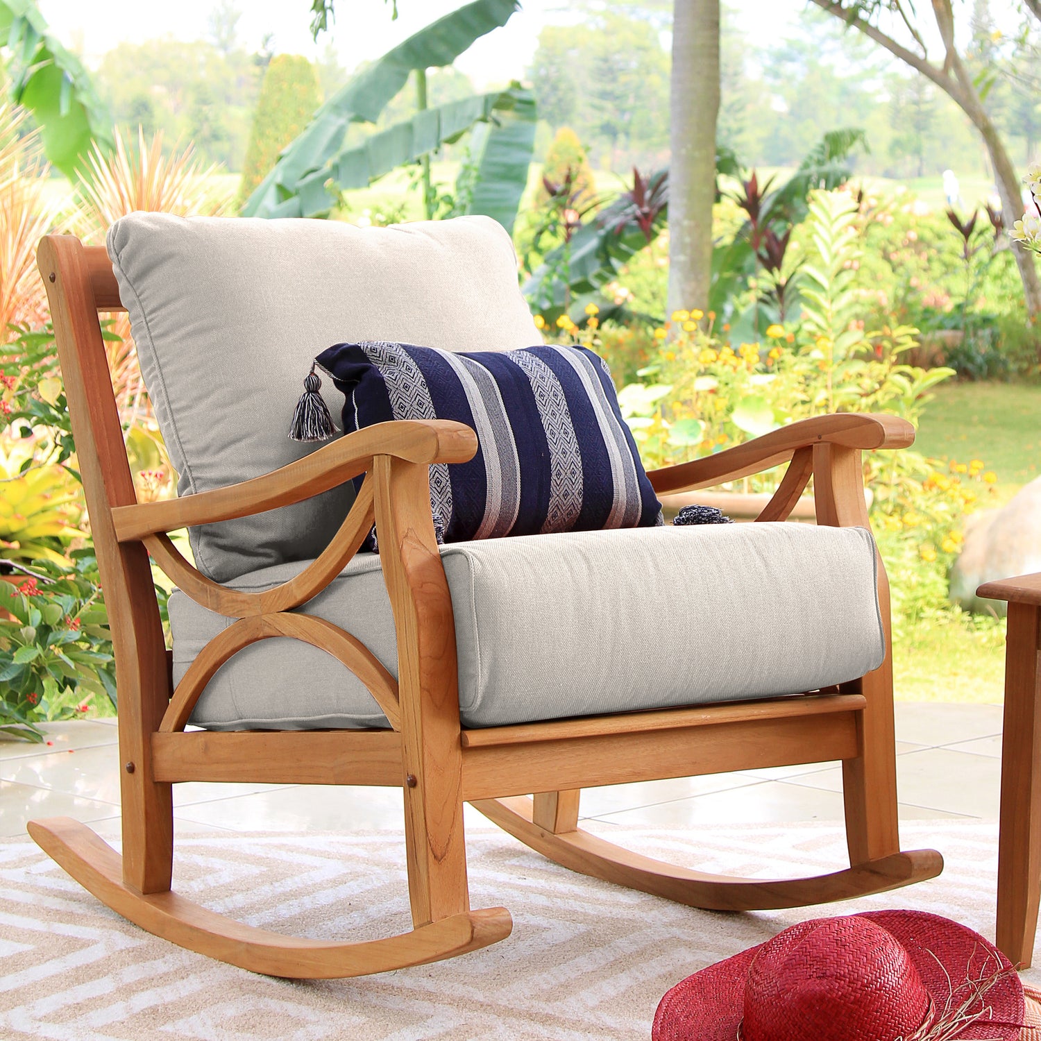 Ample seating space for comfort teak wood outdoor rocking chair with beige cushion