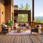 Upgrade your outdoor living with the harper teak wood outdoor 4 pieces conversation set, featuring two teak patio lounge chairs, one spacious outdoor sofa, and a large round teak coffee table with a practical lower shelf. Crafted from premium solid teak wood responsibly sourced from Indonesia, this patio conversation set offers timeless style, long-lasting durability, and comfortable outdoor seating for everyday use. The weather-resistant cushions with removable covers make cleaning easier, while the modern clean-line design brings a sophisticated touch to any patio, deck, garden, or backyard — creating a warm inviting space for relaxing or entertaining outside.