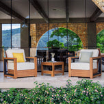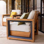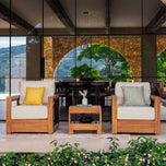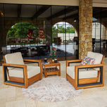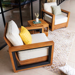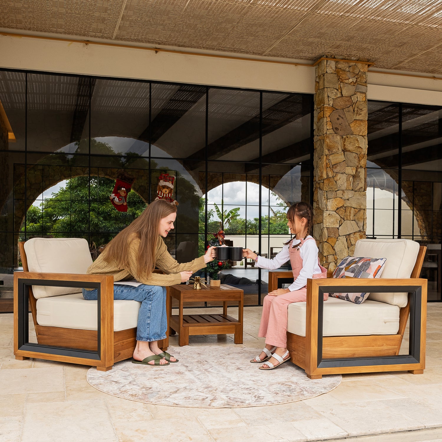Upgrade your outdoor space with the hans teak wood 3 pieces patio conversation set with ivory cushion, a stylish and durable addition to any patio, deck, or backyard retreat. Crafted from premium Indonesian teak wood, this outdoor conversation set features a finely sanded natural teak finish that enhances the wood’s natural grain and warmth. The set includes two lounge chairs and a matching side table, all supported by a strong aluminum frame with a black matte powder coat for added stability and a modern look. Thick ivory cushions provide a comfortable seat and are designed for easy maintenance and lasting outdoor use, making this the perfect setting for relaxing or entertaining outdoors.