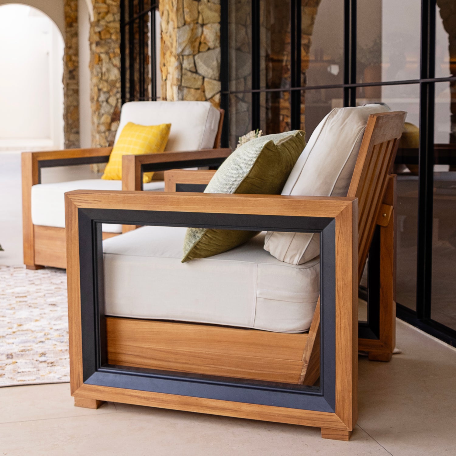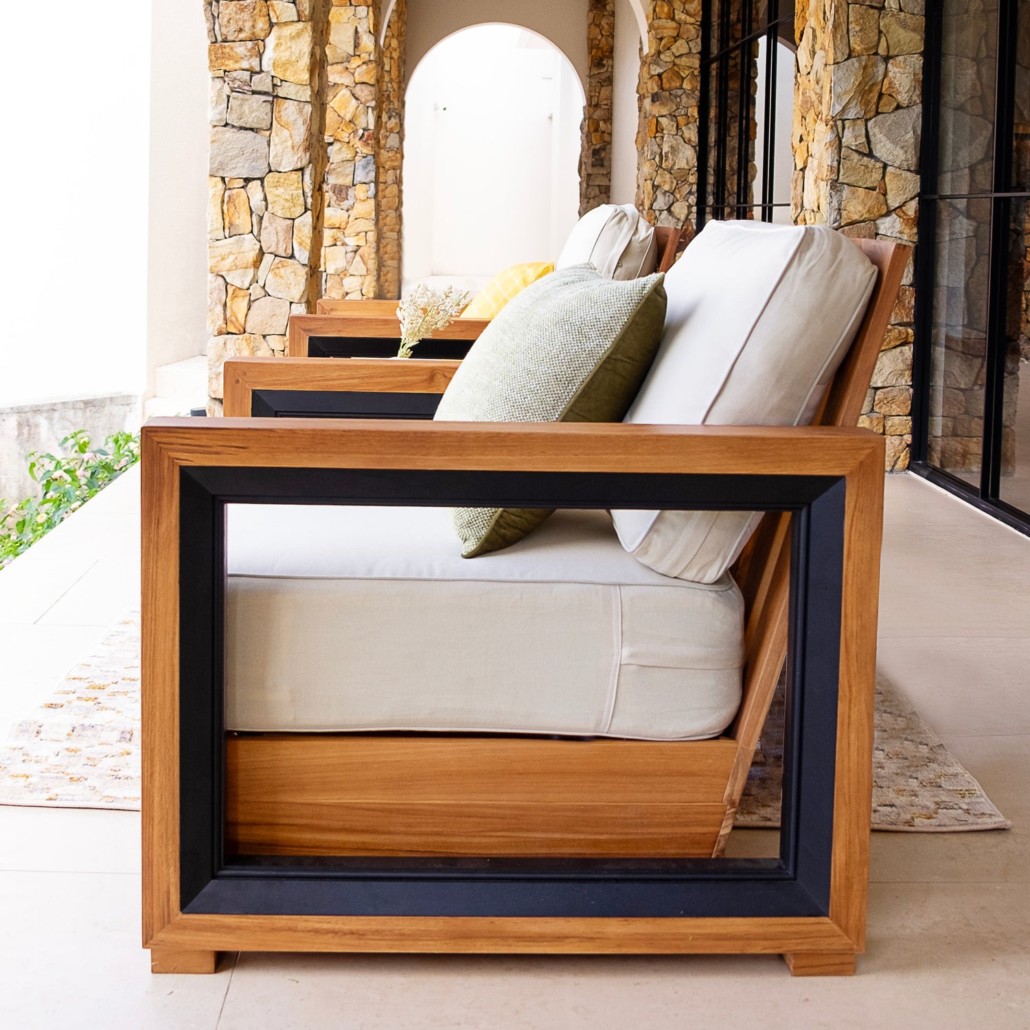 Teak patio set with ivory cushion and black frame adds comfort and style outdoors