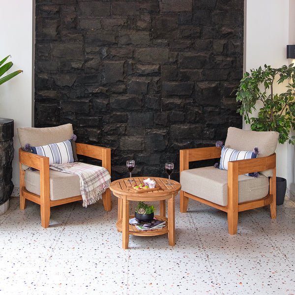 Cambridge Casual offers a variety of wood patio furniture sets, available in different styles, materials, sizes, and colors to suit any outdoor setting. Our patio conversation set options range from cozy two-seaters to spacious four-person arrangements, ensuring everyone finds their ideal match. If you love a farmhouse-style patio set, our Abbington and Caterina chat sets bring a fresh and inviting look. Prefer something bold? The Palma collection blends solid teak wood outdoor furniture with woven wicker for a sophisticated touch. For a unique and playful vibe, the Carlota collection adds character, while the Richmond range embodies timeless elegance loved by all generations. No matter your style, our chat sets will elevate your outdoor space.
