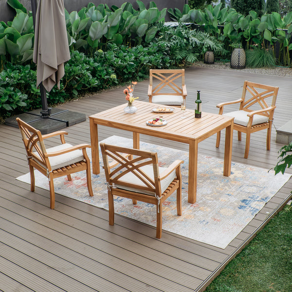 If you’re looking for a stylish yet durable outdoor dining set, Cambridge Casual offers a wide range of teak patio furniture that enhances your patio, deck, or garden. Our teak wood dining sets are crafted to withstand various weather conditions, ensuring longevity and beauty. Choose from traditional or modern patio dining sets, available in different colors, sizes, and finishes to match your outdoor decor. Some sets come with benches for a casual feel, while others feature chairs with cushions for maximum comfort. Whether you need a small dining set for intimate gatherings or a large patio dining set for entertaining guests, we have options to fit every outdoor setting.