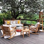 Introducing the comfort and durability of a teak wood outdoor rocking chair with beige cushion, featuring a natural, finely sanded finish for timeless appeal. Crafted from high-quality Indonesian teak with meticulous attention to detail, this rocking chair combines durability and elegance, ideal for enhancing your outdoor space. The removable olefin fabric cover ensures easy maintenance, allowing for convenient cleaning and longevity.