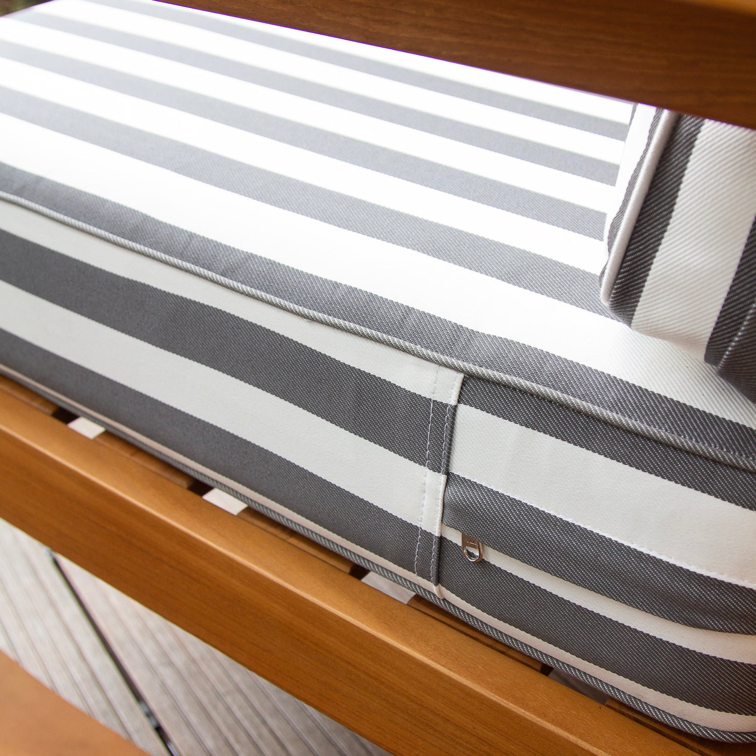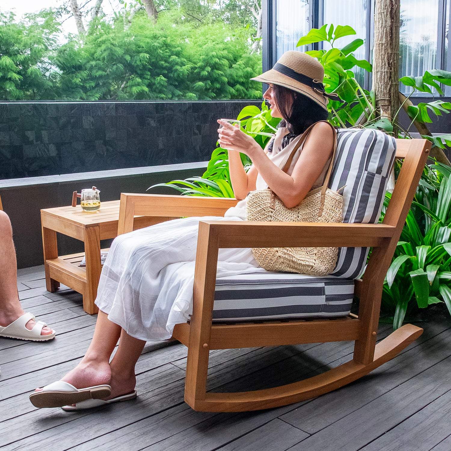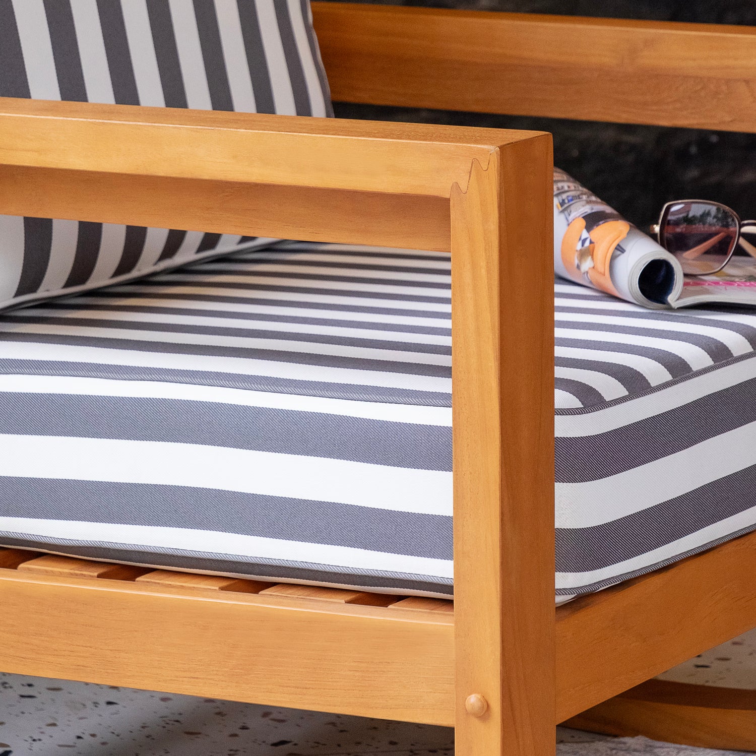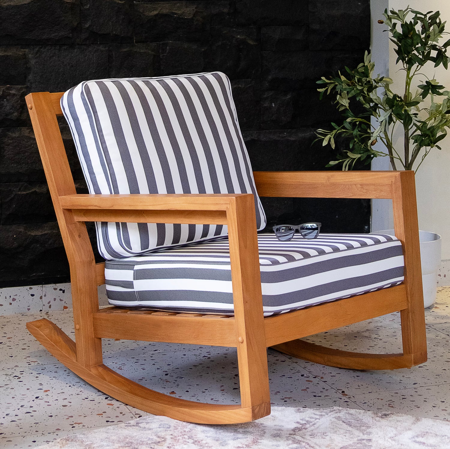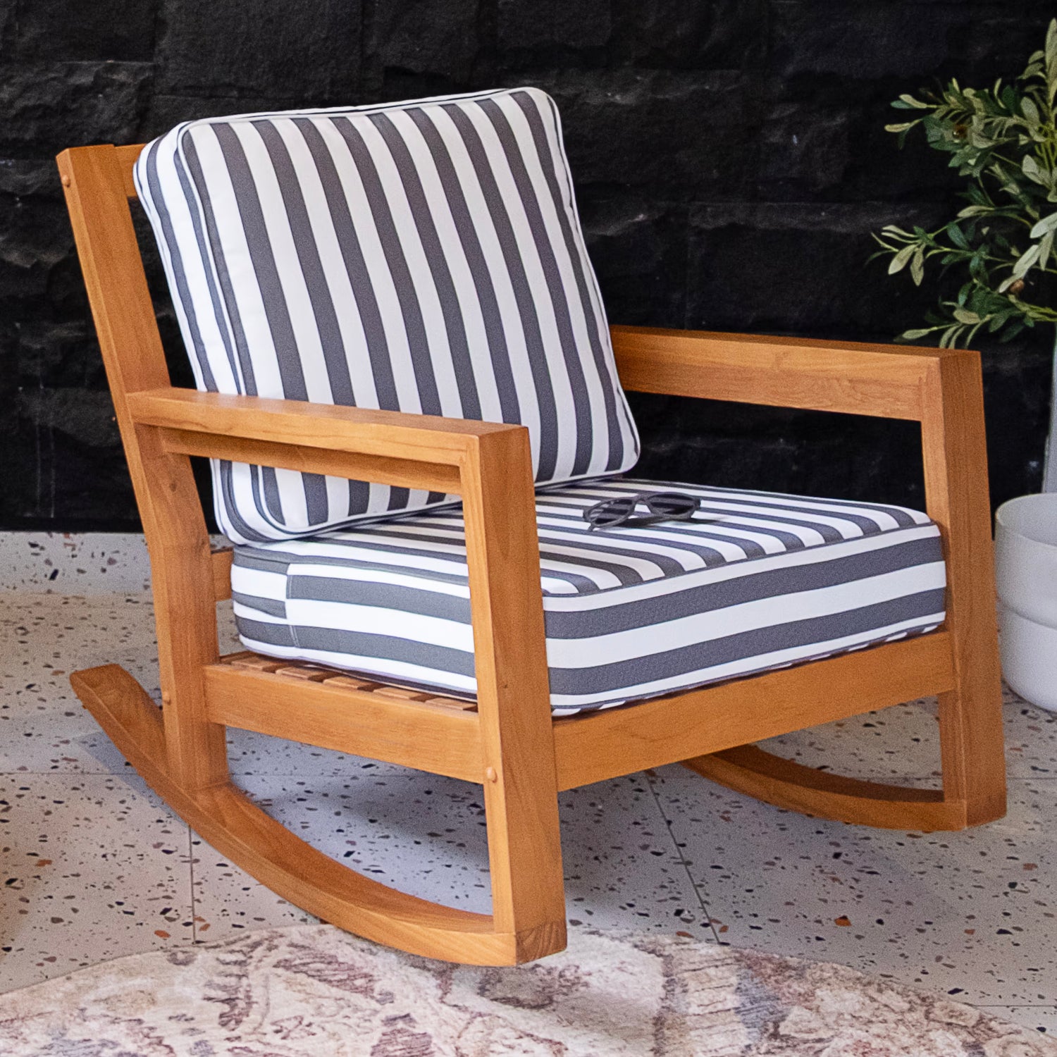 This teak outdoor rocking chair brings timeless style and everyday comfort to your outdoor space. Crafted from durable Indonesian teak with a smooth, finely sanded natural finish, it’s made to handle outdoor conditions while keeping its elegant look. The stripe white gray cushion adds a clean, modern touch and makes it easy to relax in comfort.