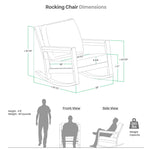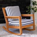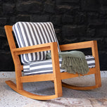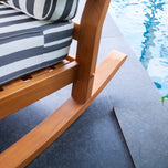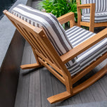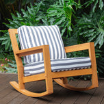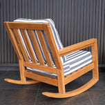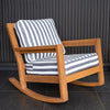 The teak wood patio rocking chair with stripe white gray cushion features a curved rocker bar that provides gentle rocking movements