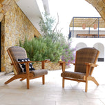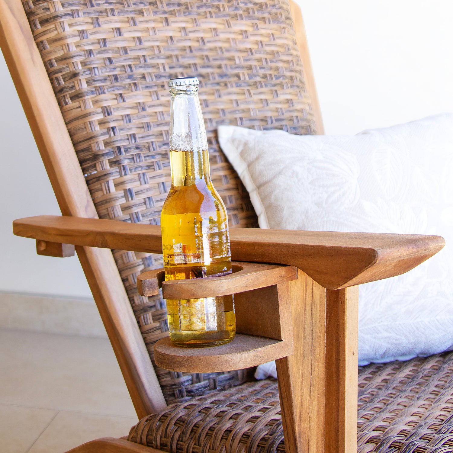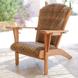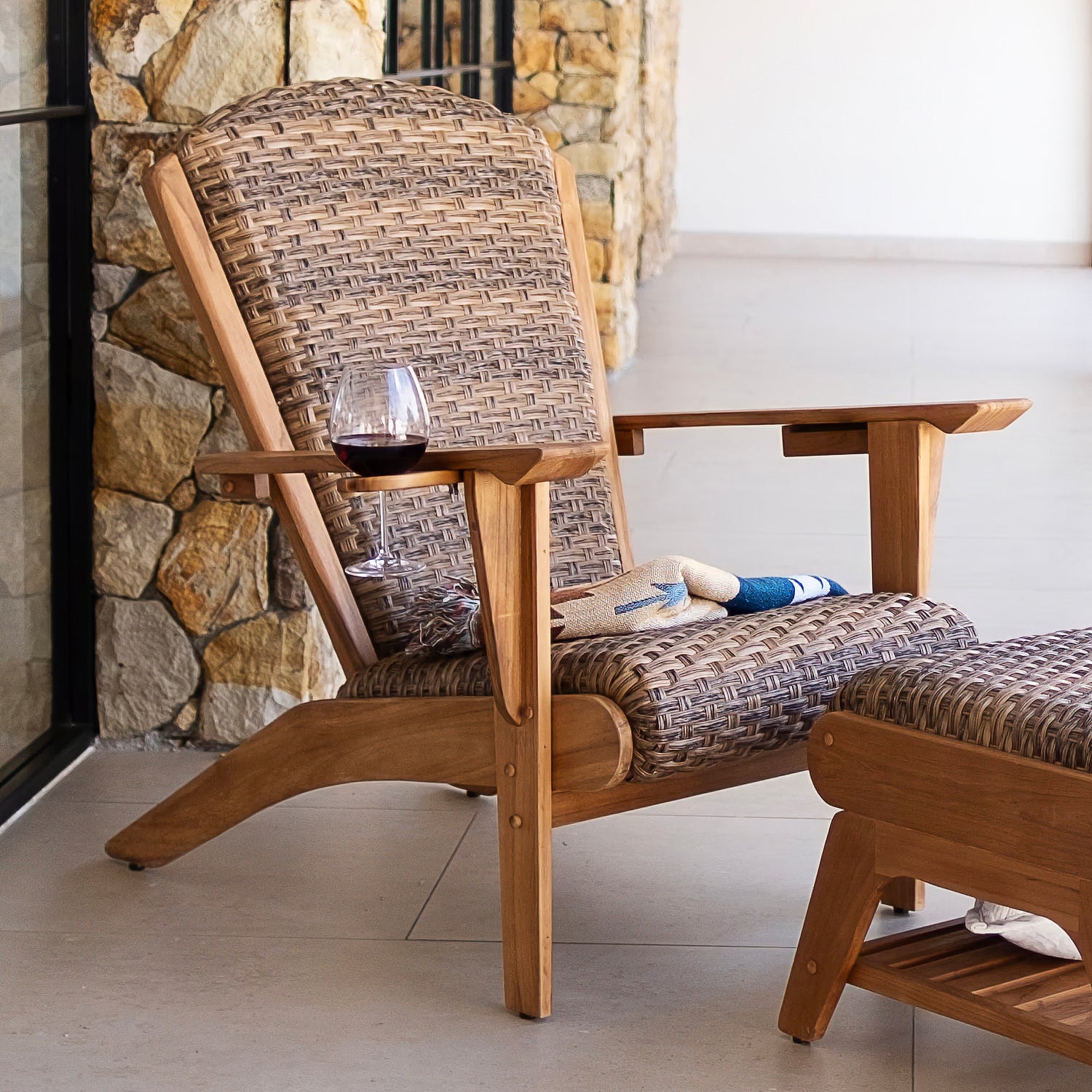 Experience ultimate outdoor relaxation with the camden teak porch adirondack chair with padded woven seat – FREE furniture cover. Crafted with attention to detail, this piece combines superior Indonesian teak, Brown Waterhyacinth all weather synthetic wicker, and high density foam for a remarkable teak patio furniture experience. The earthy tones of the natural teak finely sanded finish and wicker weaving bring elegance to your patio, deck, or backyard retreat. Designed as a weather resistant outdoor lounge chair, it offers low maintenance outdoor seating that blends timeless style with everyday comfort, perfect for anyone seeking durable outdoor furniture with refined appeal.