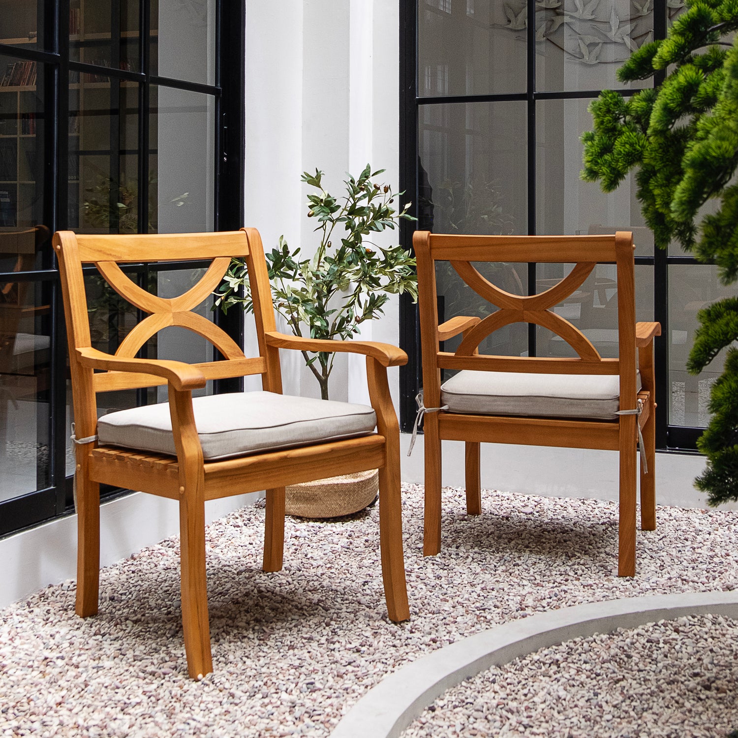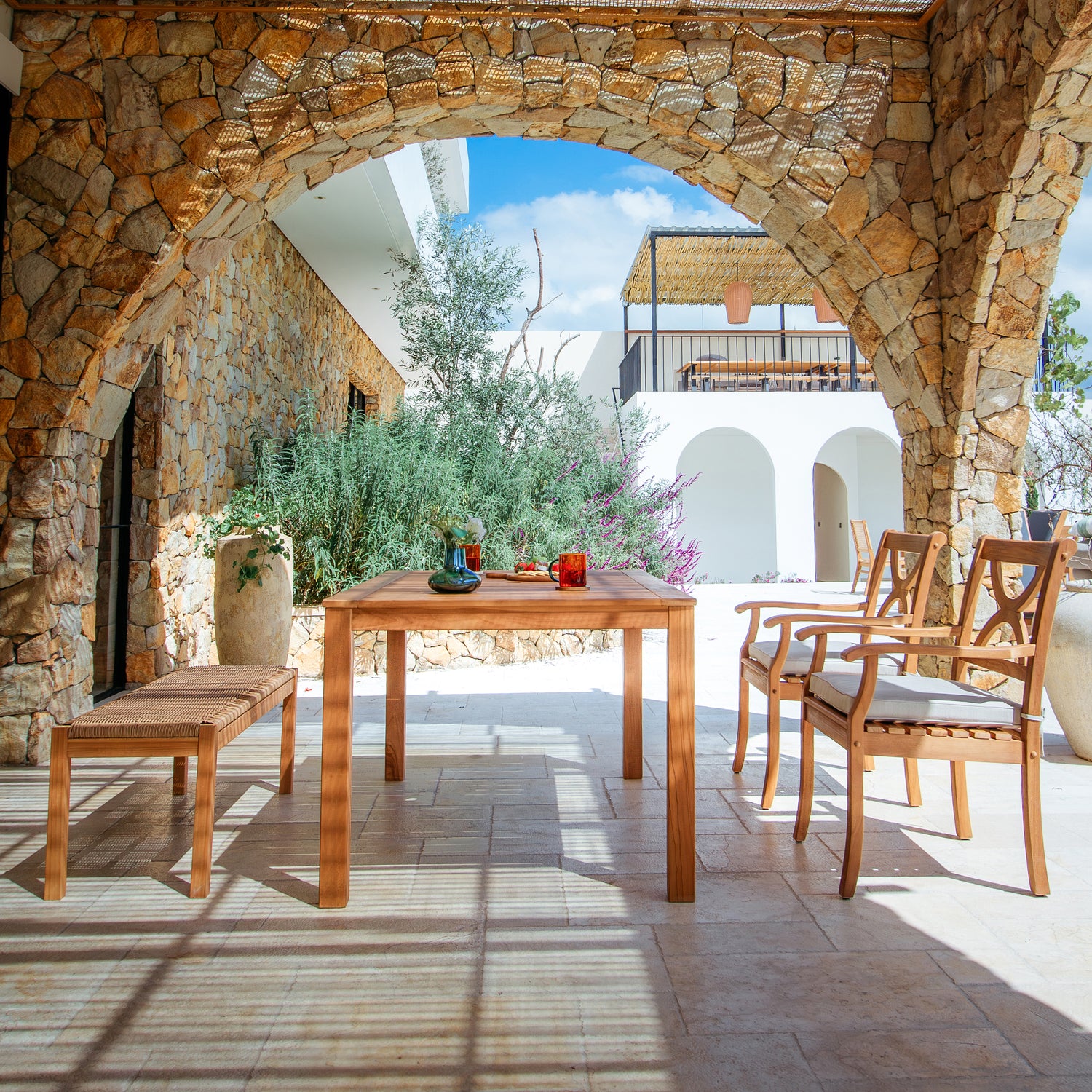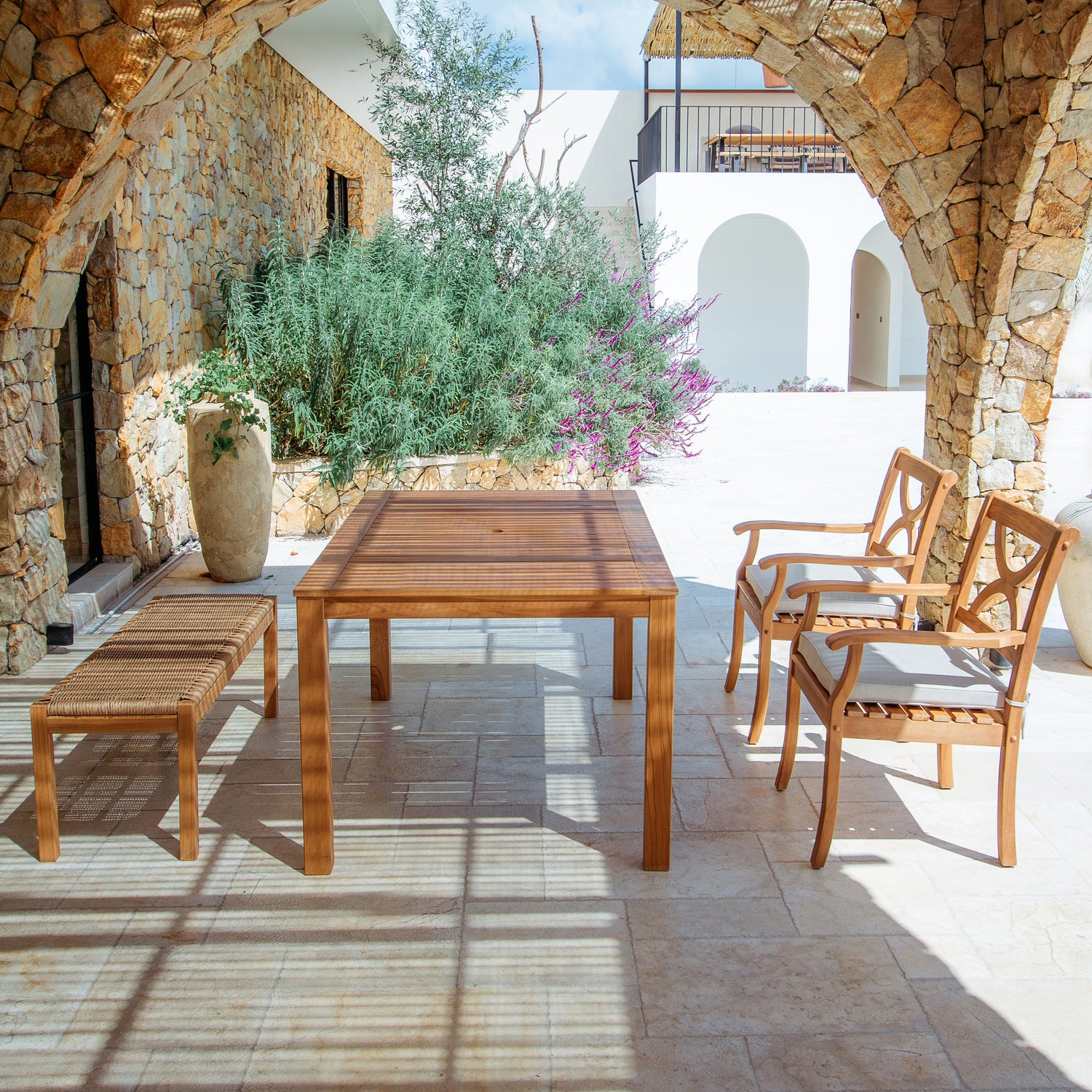 Upgrade your patio with the abbington teak wood 4 pieces outdoor dining set with backless bench, a perfect blend of style and durability for any outdoor dining space. Made from premium Indonesian teak wood with a smooth natural teak finish, this weather-resistant teak patio dining set includes two comfortable teak dining chairs, one versatile teak backless bench, and a sturdy outdoor dining table. Seatpads add a cozy touch, making this the ideal teak outdoor furniture for hosting or relaxing year-round.