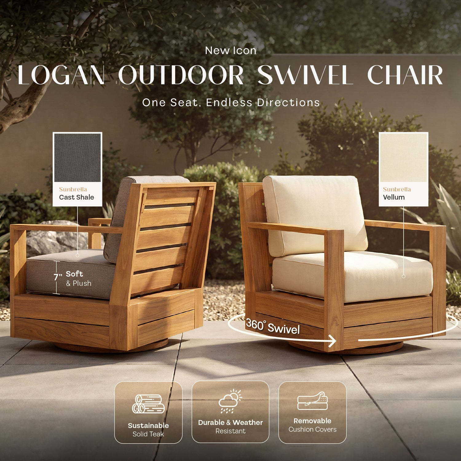 The logan teak wood 5 pieces patio conversation set with sunbrella vellum cushions offers comfort and timeless style for your outdoor space. Made from excellent Indonesian teak with a natural finely sanded finish, this teak patio conversation set is built for durability and long lasting beauty. The vellum sunbrella cushions provide great water resistance to help keep your outdoor furniture fresh. This outdoor conversation set includes a patio sofa, one swivel chair with smooth 360 degree motion, one lounge chair with premium foam cushions, one coffee table, and one side table, creating a cozy and functional outdoor seating space.