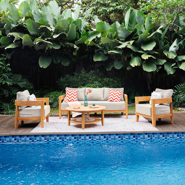 Beyond dining, patio conversation sets are a perfect way to create an inviting, intimate space in your garden or backyard. These outdoor seating sets, often featuring larger cushioned patio chairs and smaller patio tables, provide a cozy spot for relaxation and conversation. Whether you prefer smaller outdoor chat sets, teak seating sets, teak patio sets, or patio sectional sets, we offer a variety of patio furniture to suit your needs. For true relaxation, try the Abbington 3 Piece Outdoor Rocker Chat Set with navy cushions. No matter your space—large or small—we have the right teak outdoor furniture, outdoor lounge sets, and patio sets to bring your vision to life and help you enjoy the outdoors fully.