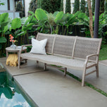 Introducing the Dunham weathered teak wood patio sofa—a stylish and durable outdoor piece designed to bring comfort and character to your space. Crafted from premium Indonesian teak, it features a weathered gray finish paired with rustic koboo gray accents, creating a balanced look of timeless elegance and sturdy construction. Whether placed on a patio, porch, or garden corner, this sofa offers a warm, inviting feel and dependable comfort for everyday outdoor living.
