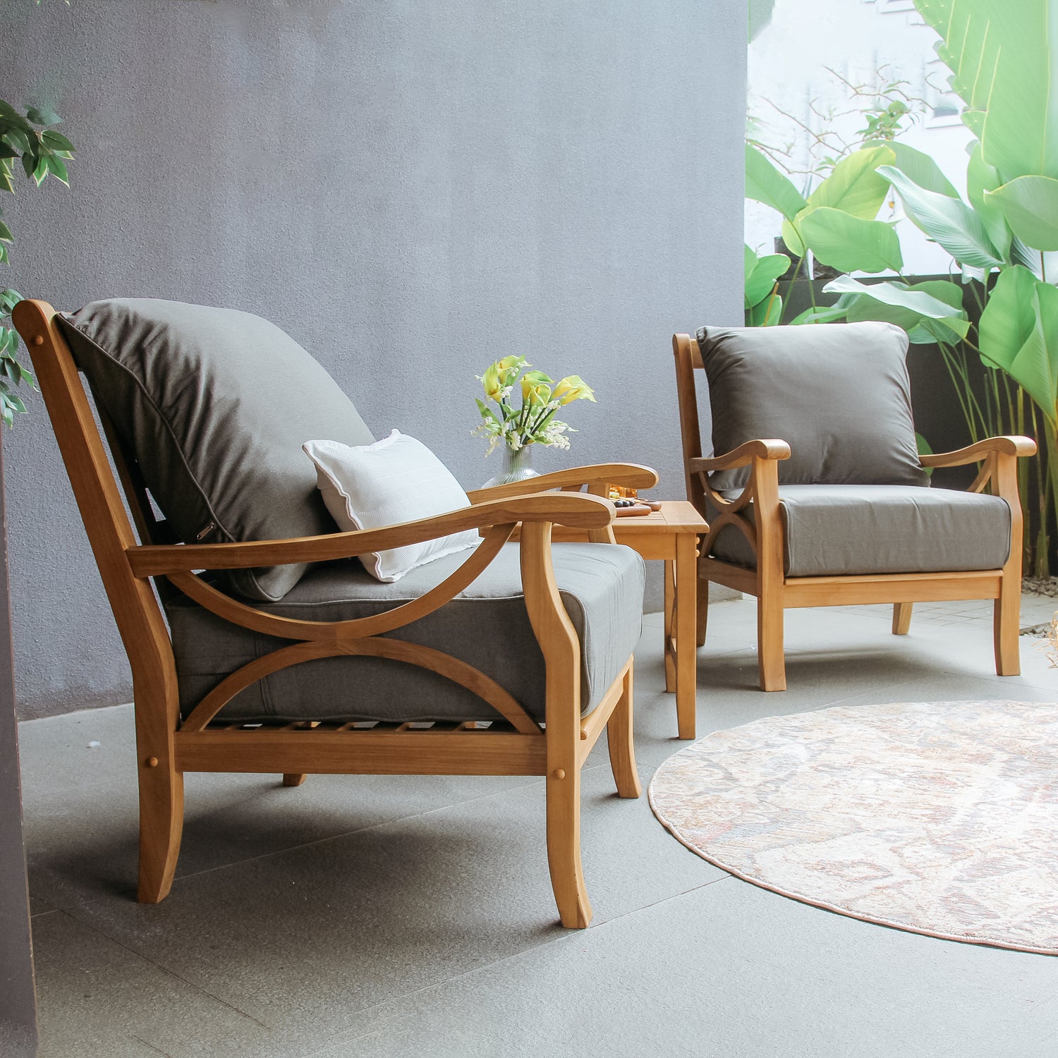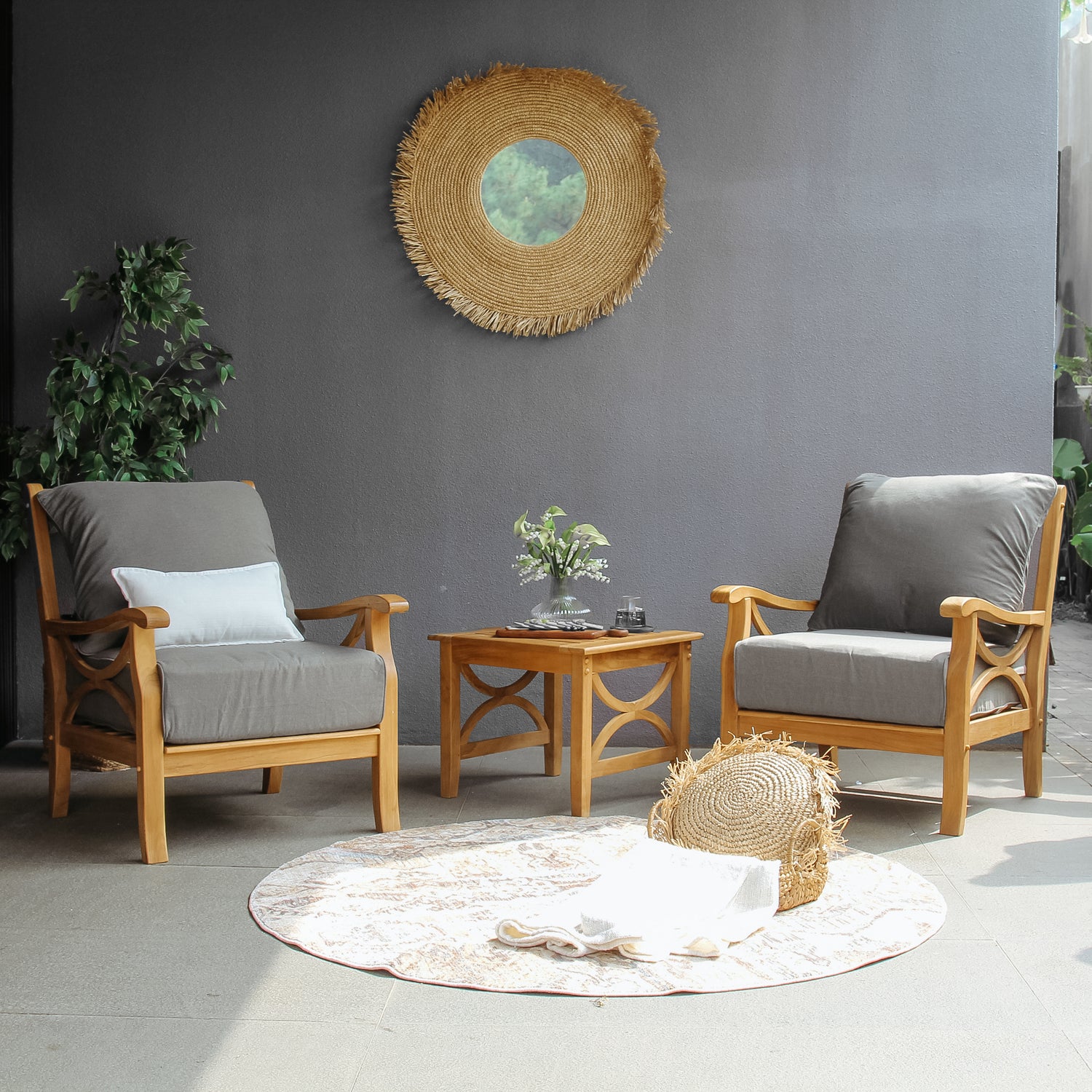 Ample seating space for comfortable seating on your teak wood 3 pieces patio conversation set with gray cushion