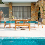 Experience comfort and durability with our eden teak wood 6 pieces outdoor dining set with gray polyrope, where natural teak pairs with modern gray polyrope weaving for a seamless o