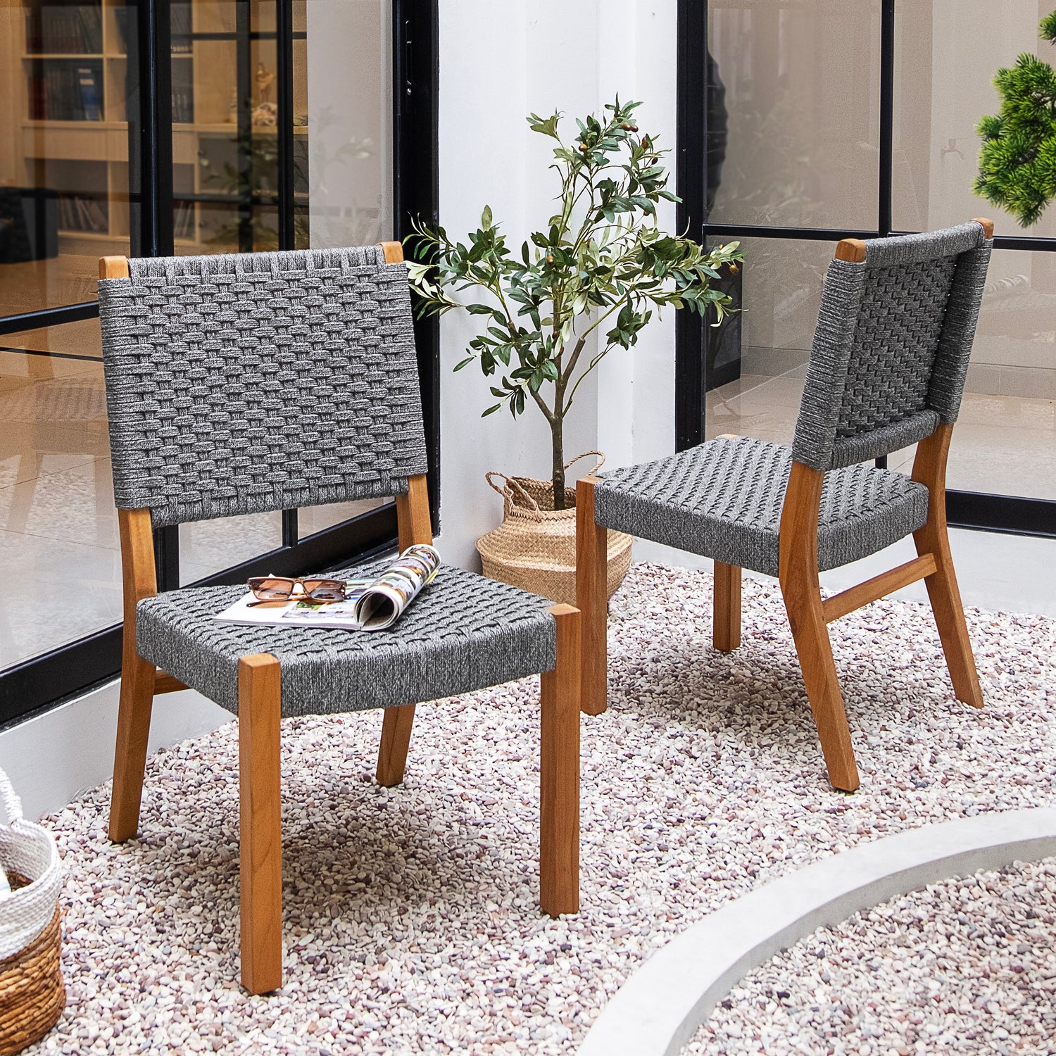 • Made from premium Indonesian teak with a natural teak finely sanded finish and gray polyrope weaving