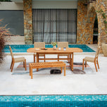 Indulge in the timeless elegance of the eden teak wood 6 piece outdoor dining set with tan polyrope, where natural teak creates a seamless outdoor dining experience. Crafted from superior Indonesian teak known for its durability and aesthetic charm, this set ensures lasting enjoyment throughout the year