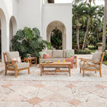 Elevate your outdoor relaxation with this teak wood 5 piece patio conversation set with beige cushions, crafted from premium Indonesian teak with a natural finely sanded finish. Built to endure all seasons, this weather-resistant patio furniture includes two lounge chairs, one sofa, a coffee table, and a side table. The olefin outdoor cushions are plush, water-repellent, and have removable covers for easy cleaning—perfect for enhancing your patio seating area, backyard lounge, or garden conversation space with a timeless teak patio set.