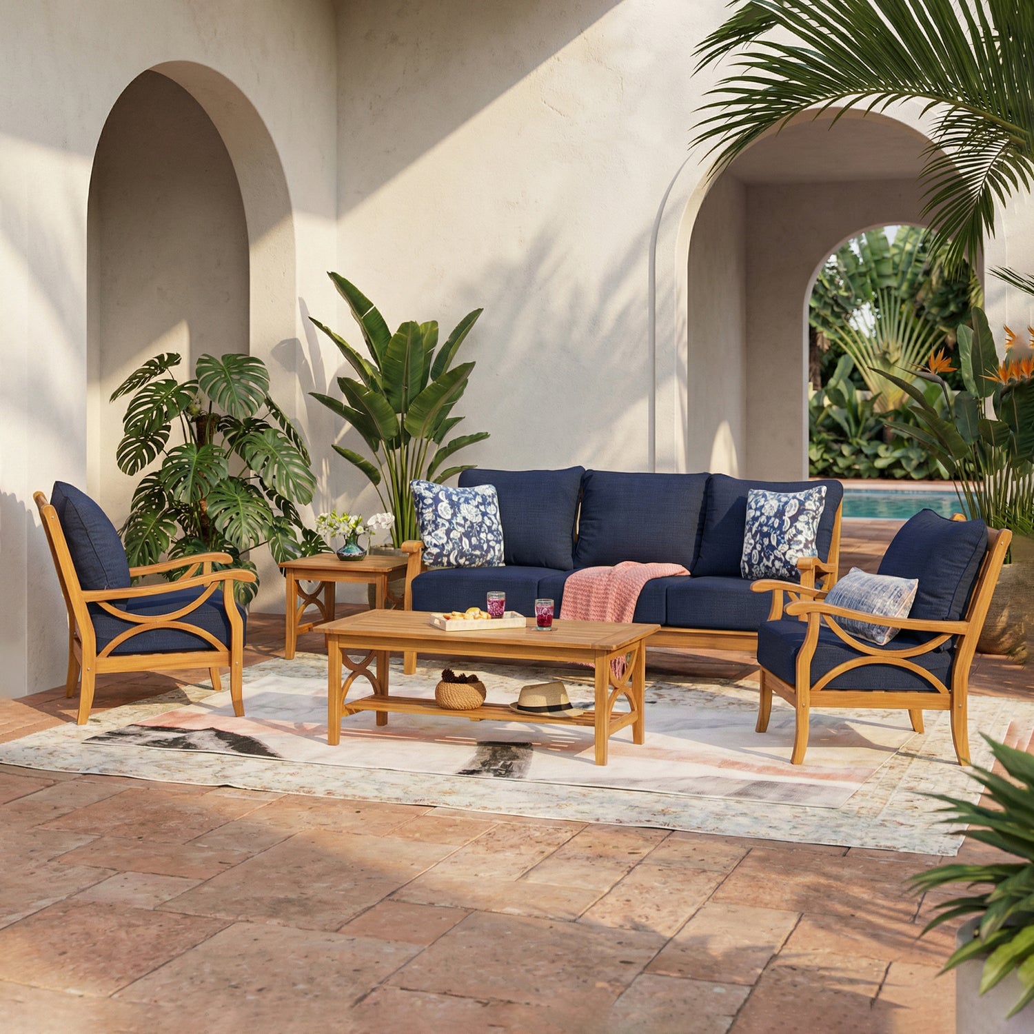 Transform your outdoor space with the teak wood 5 piece patio conversation set with navy cushion, featuring a natural teak finely sanded finish and navy cushions for a sophisticated look. Crafted from high-quality Indonesian teak wood known for its durability, this set is designed to withstand the elements year-round. The olefin fabric of the cushions and covers ensures easy maintenance, allowing for convenient cleaning.
