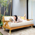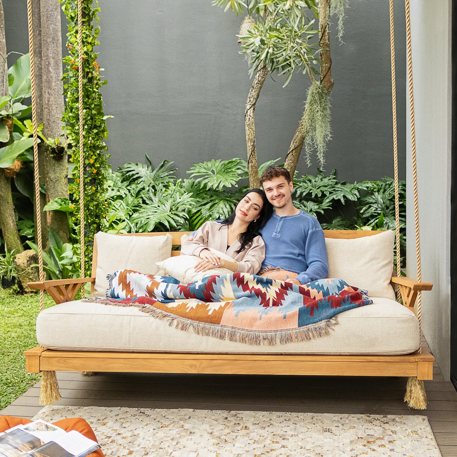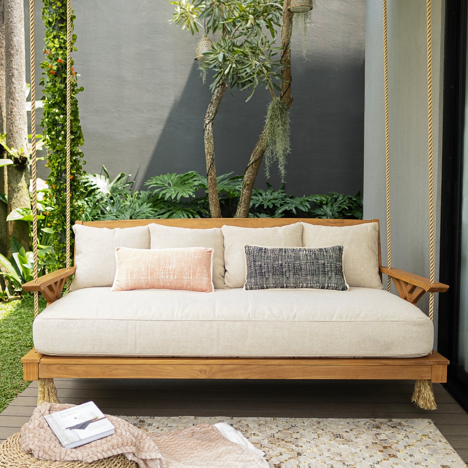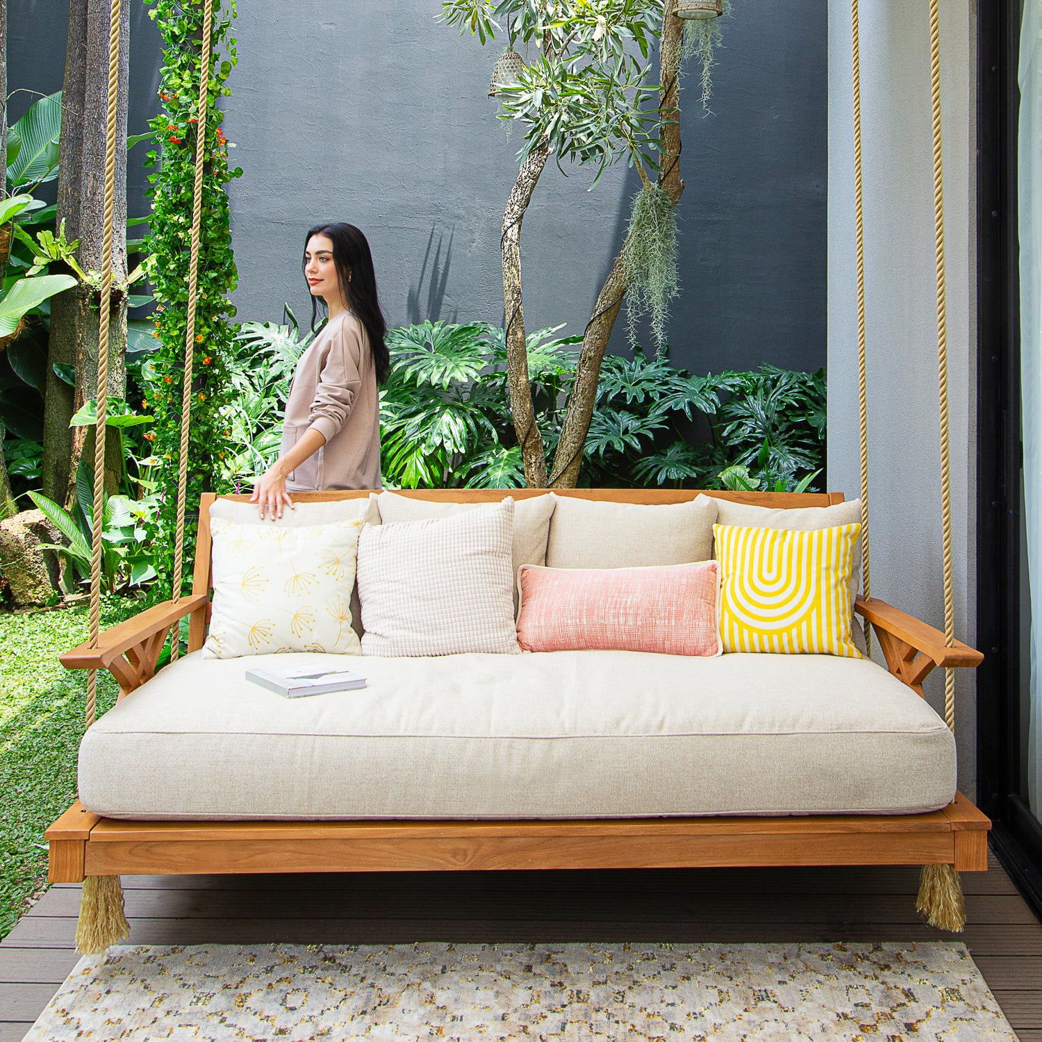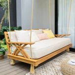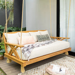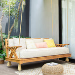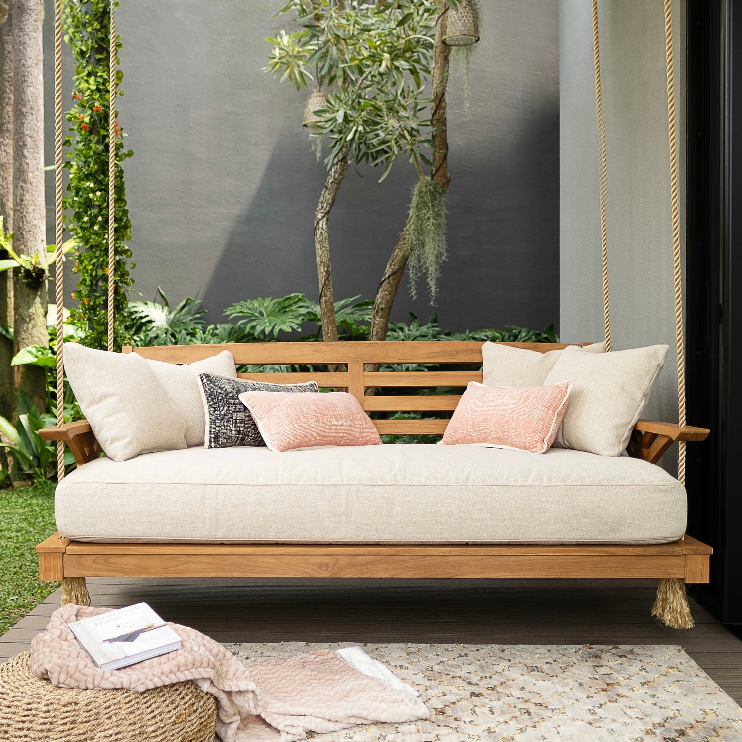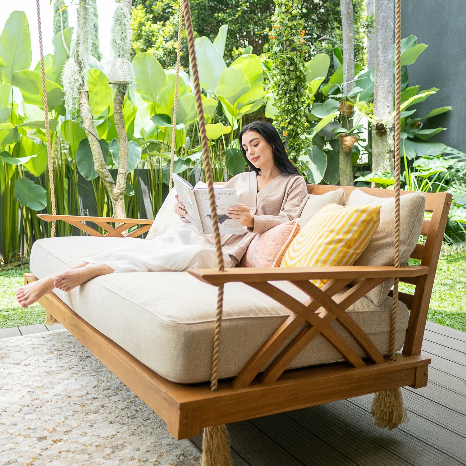 This teak outdoor swing daybed brings resort-style comfort to your backyard, combining a finely sanded natural teak finish with warm, inviting details. Crafted from sturdy Indonesian teak and paired with a cozy tan cushion and honey twist wicker accents, it creates a relaxing spot for lounging, napping, or unwinding after a long day. Thoughtfully designed for both style and function, this swing daybed offers long-lasting durability, easy-care cushions, and deep seating that makes every moment outdoors feel extra comfortable.