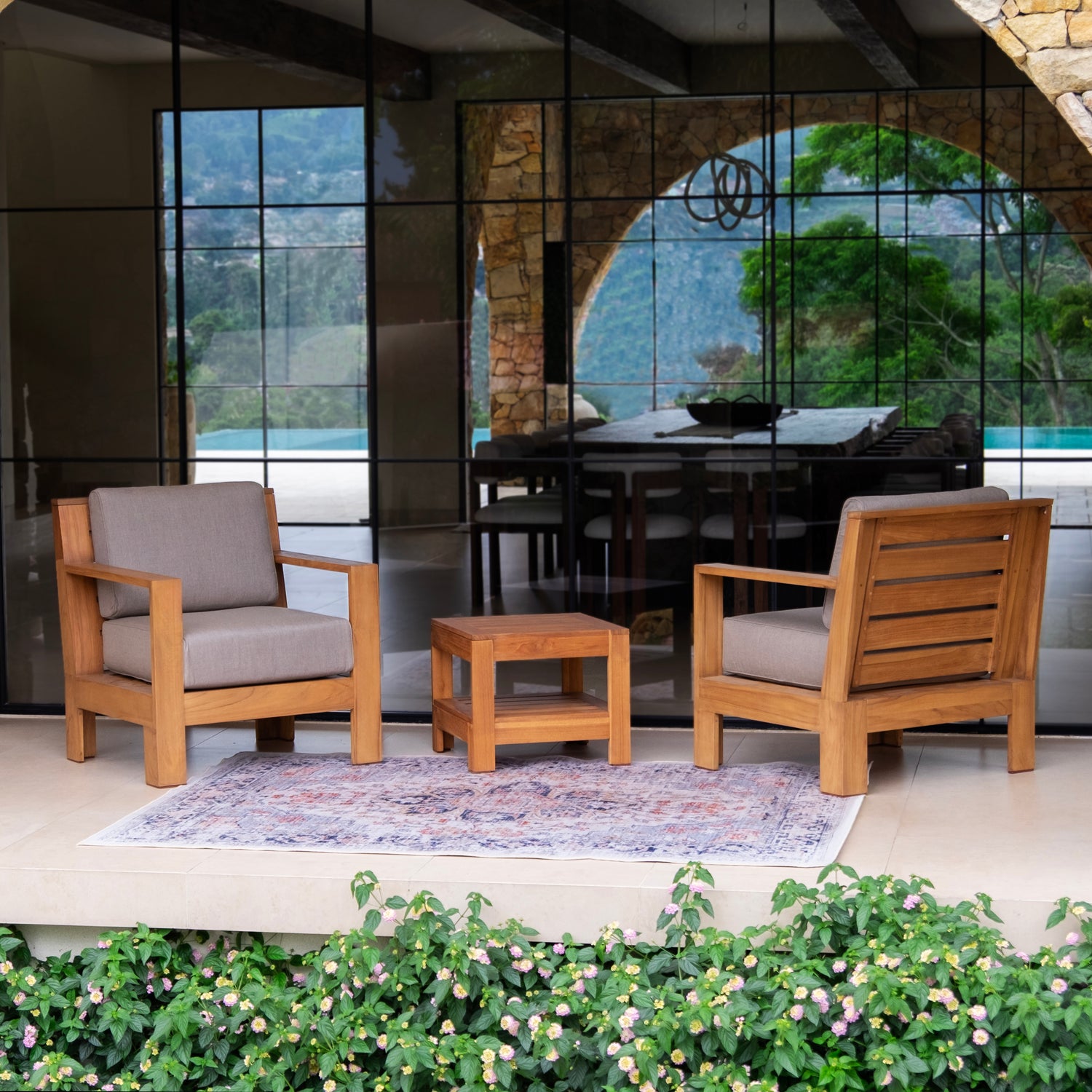 The teak wood frame's natural oil provides excellent weather resistance