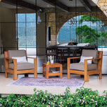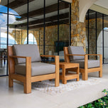 Introducing the teak wood patio conversation set with sunbrella cast shale cushion, a sophisticated addition to your outdoor living space that combines style with durability. Featuring a beautifully sanded natural teak finish and complemented by a chic cast shale cushion, this set is designed to enhance your patio experience.