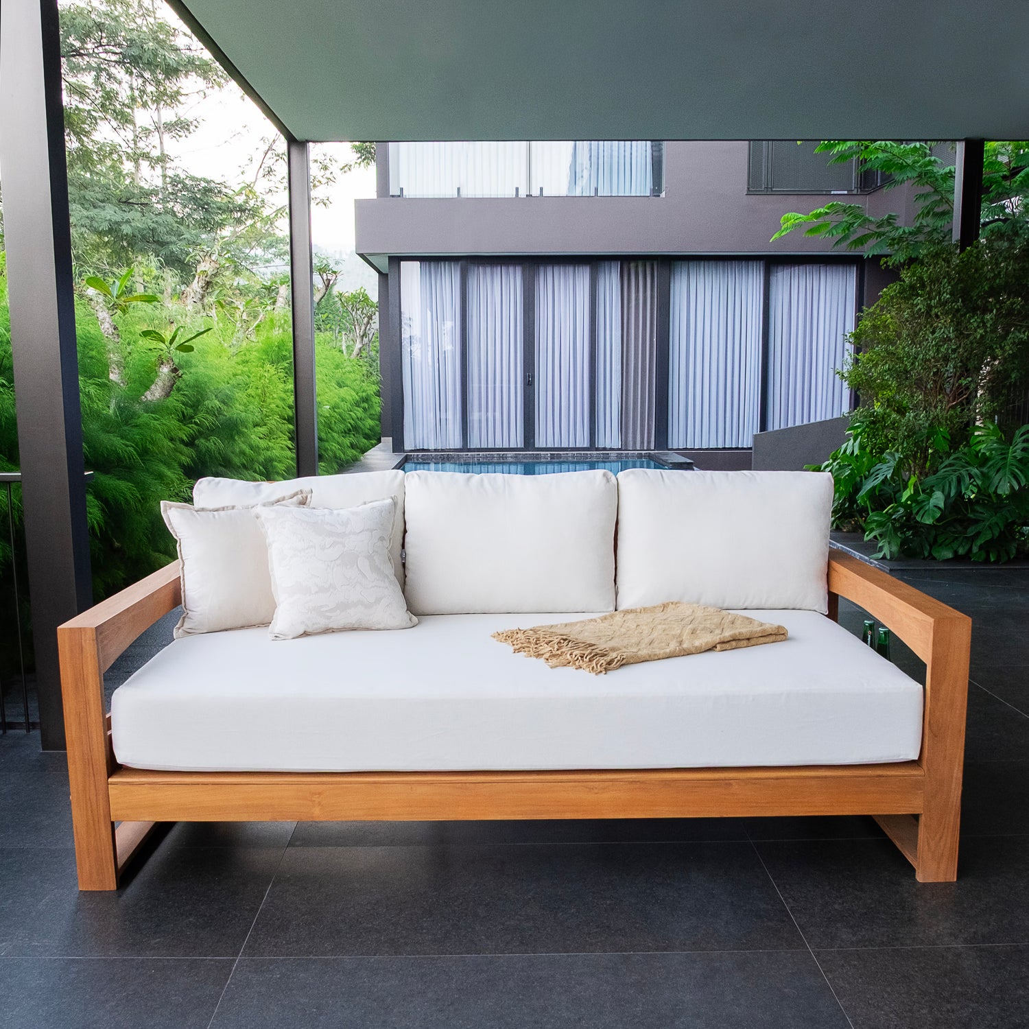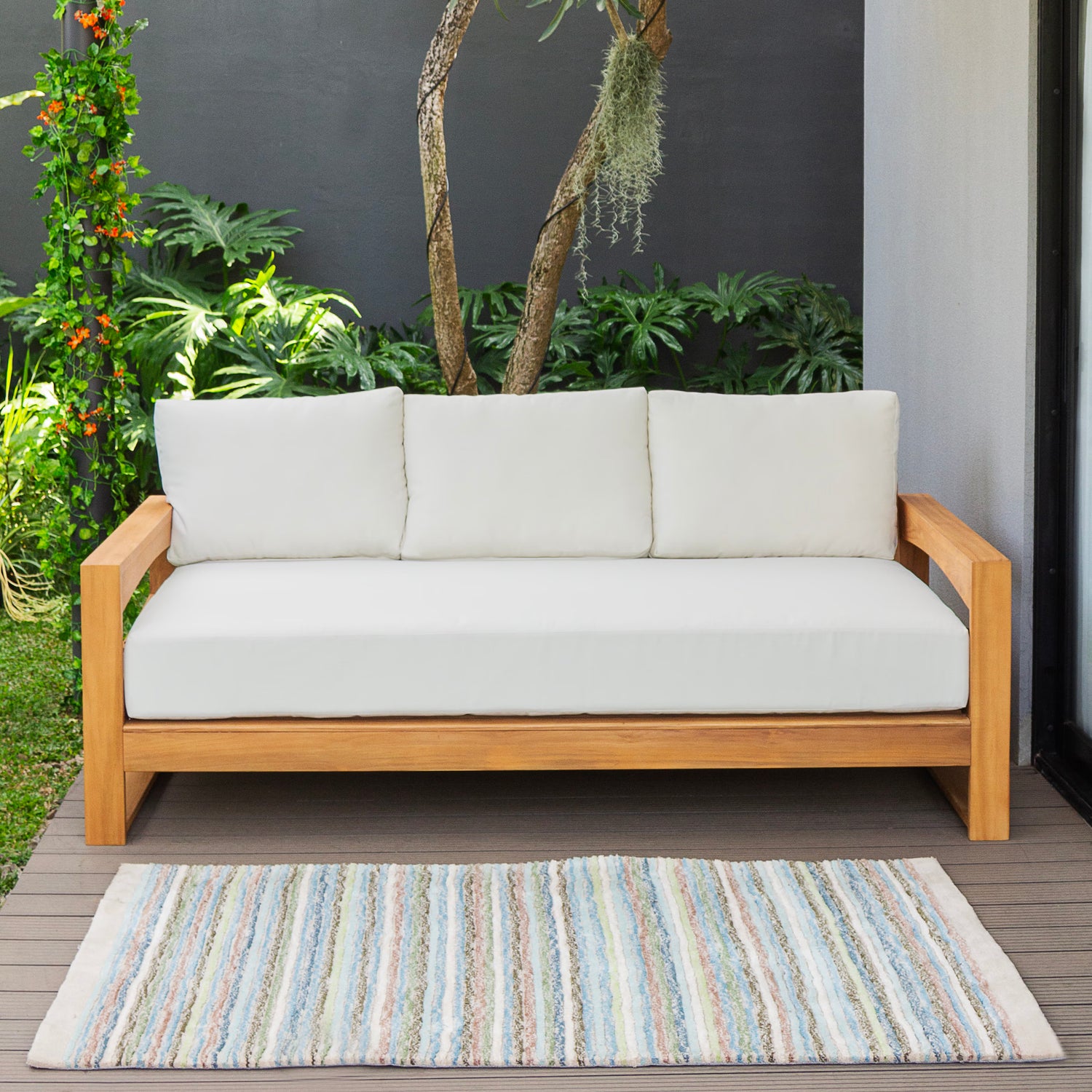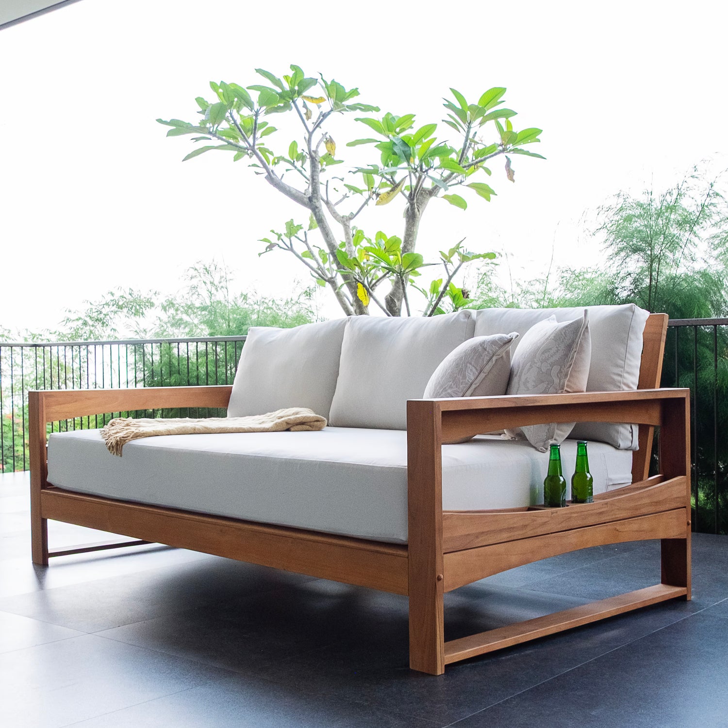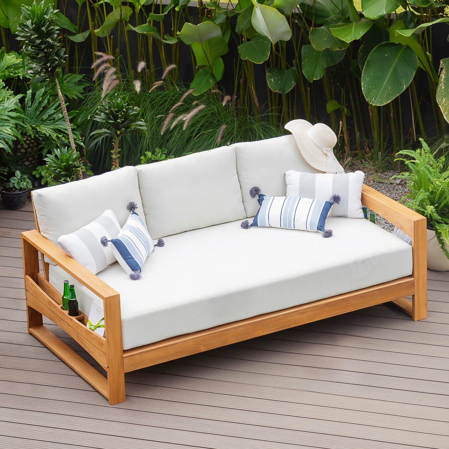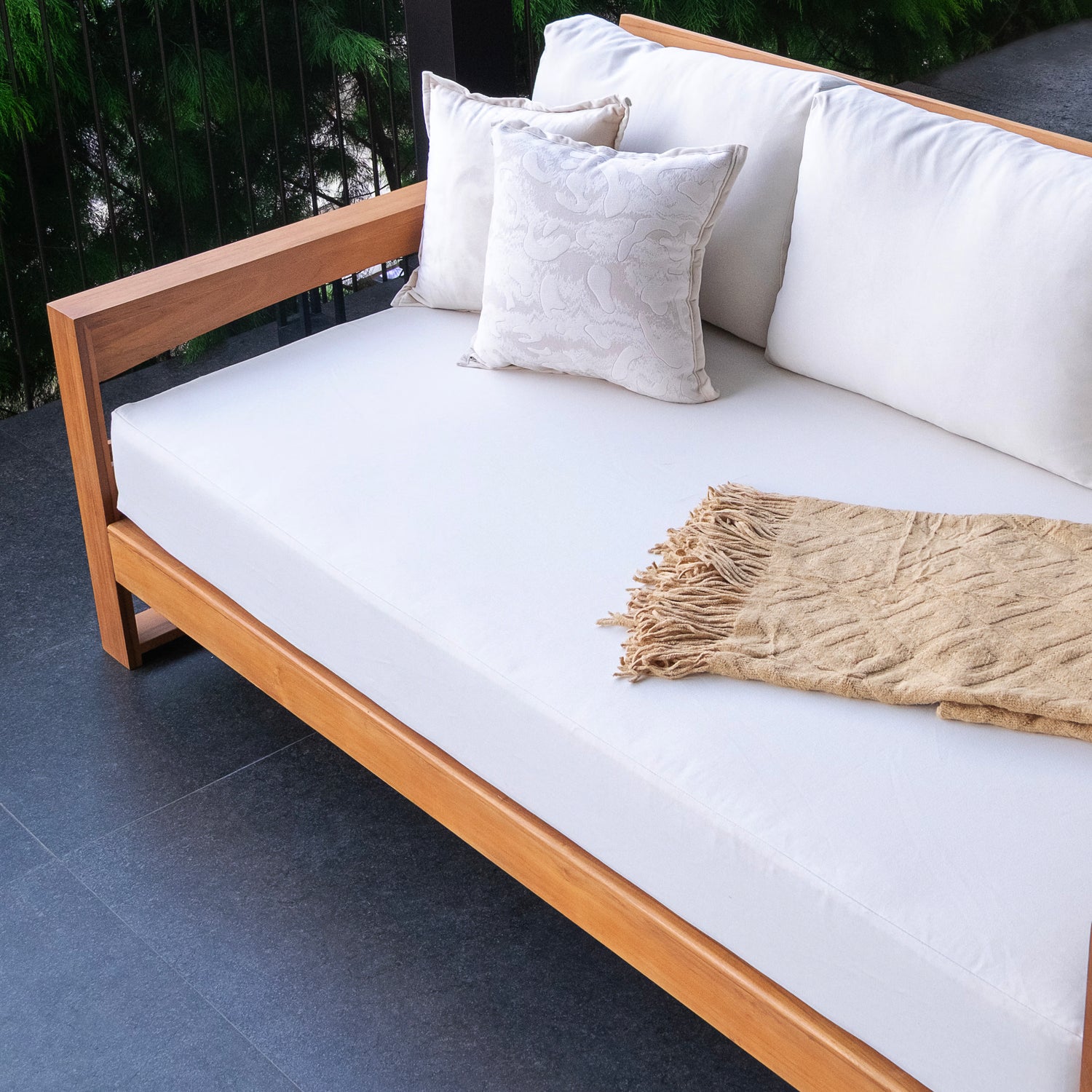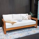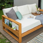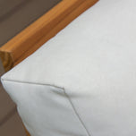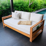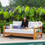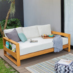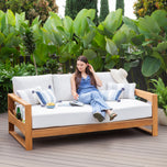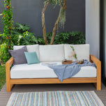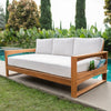 This teak patio sofa daybed features a natural teak finely sanded finish crafted from sustainable Indonesian teak known for its strength, durability, and beautiful grain. Paired with a off-white cushion, the zippered cover allows easy removal for simple cleaning. The polyester fabric is engineered with water-resistant performance, delivering lasting comfort for everyday outdoor lounging.