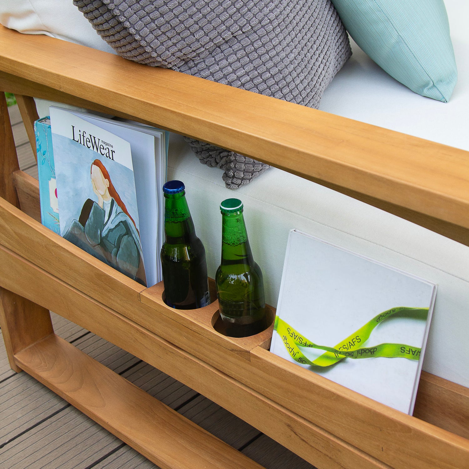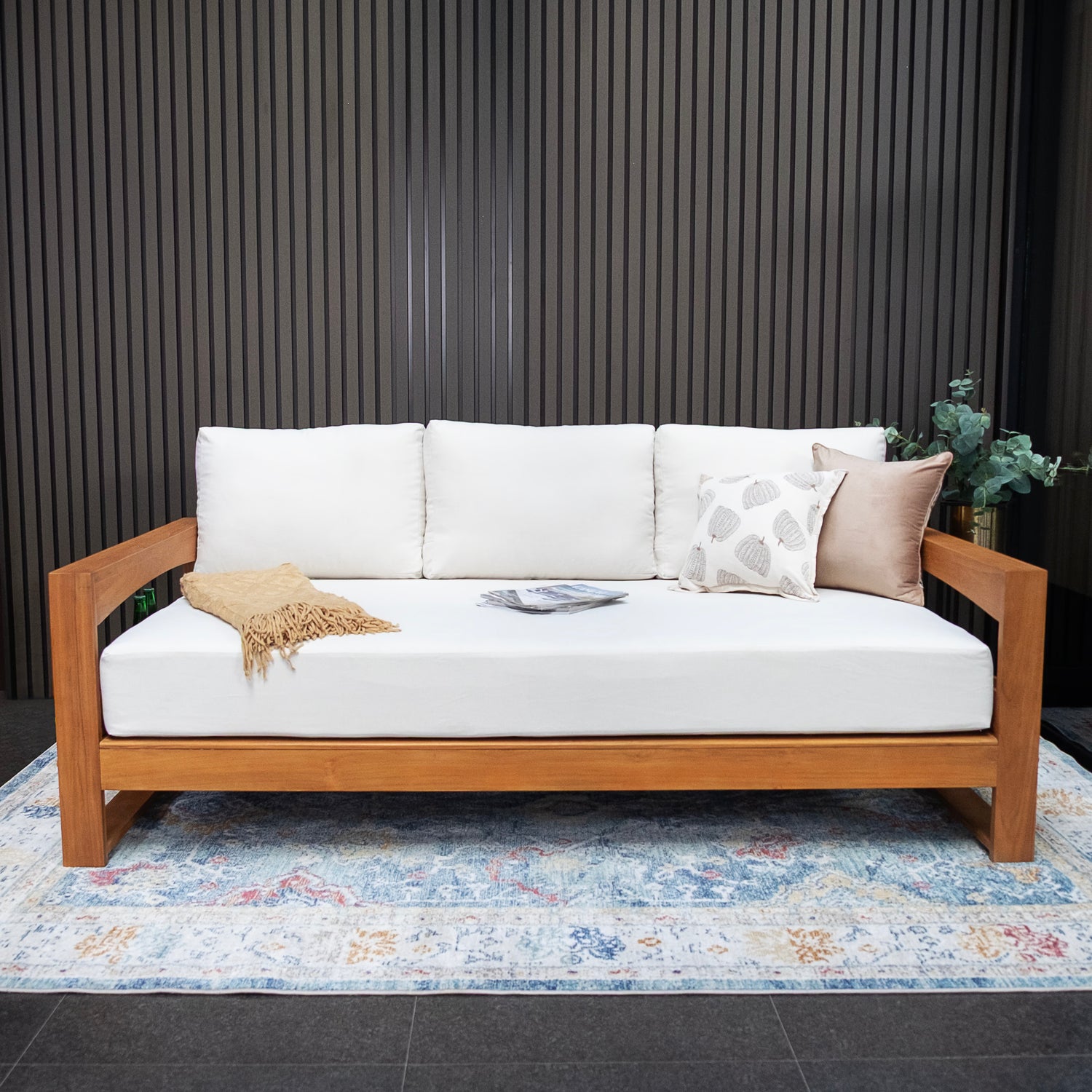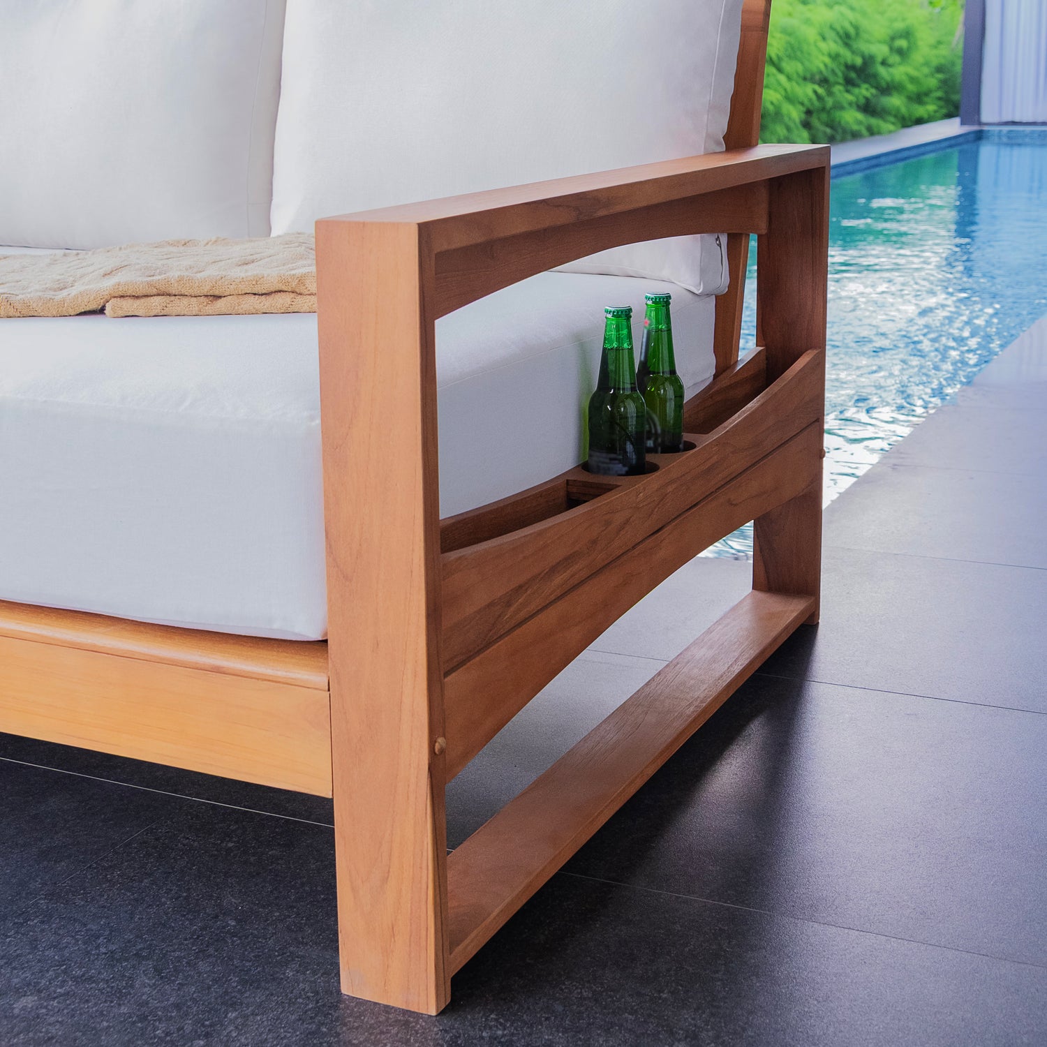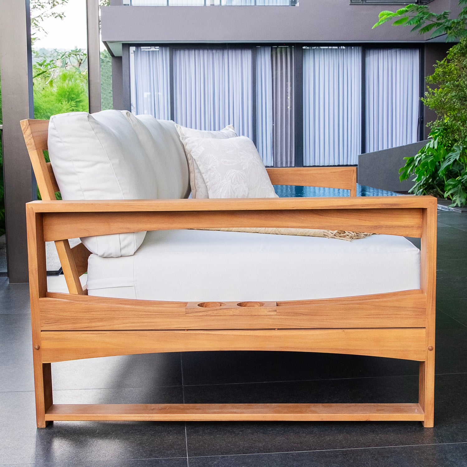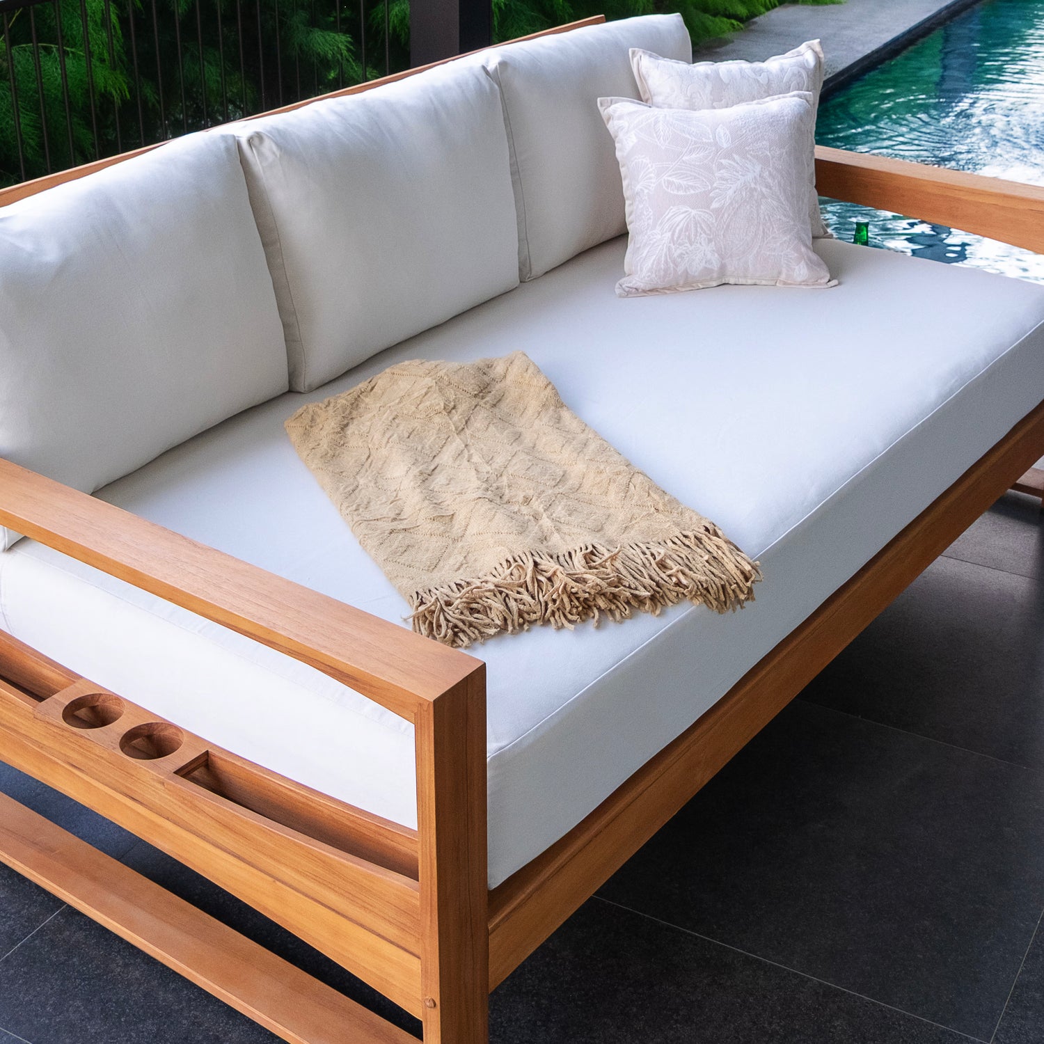 This teak patio sofa daybed features a natural teak finely sanded finish crafted from sustainable Indonesian teak known for its strength, durability, and beautiful grain. Paired with a off-white cushion, the zippered cover allows easy removal for simple cleaning. The polyester fabric is engineered with water-resistant performance, delivering lasting comfort for everyday outdoor lounging.