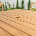 This teak dining table has an umbrella hole for shade on sunny summer afternoons