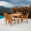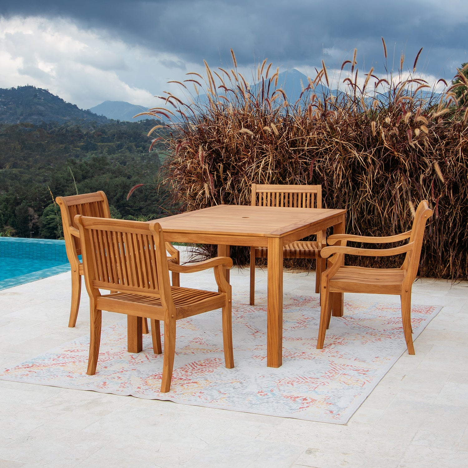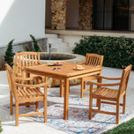 Elevate your outdoor dining experience with this 5 pieces teak wood dining set, expertly crafted from premium Indonesian teak with a finely sanded natural finish. The sleekly designed armchairs provide exceptional comfort, perfect for enjoying long conversations.